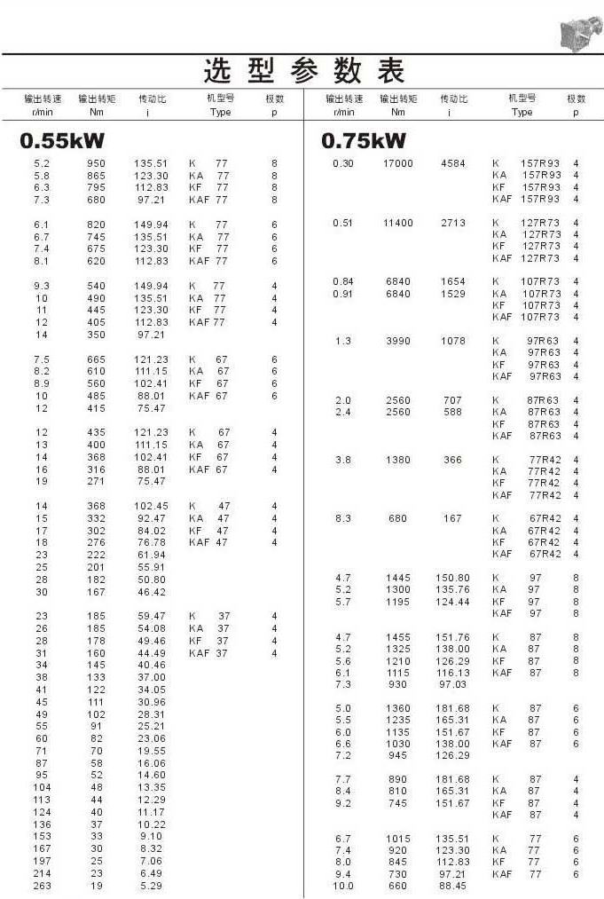 選型參數(shù)表0.55kW(續(xù))和0.75kW