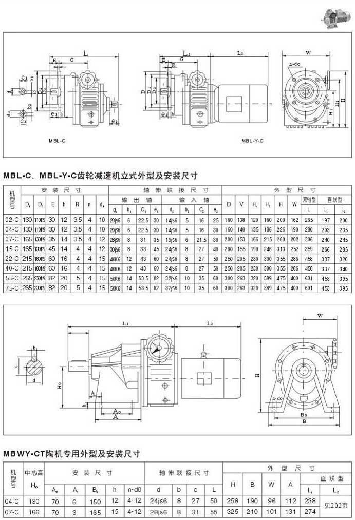 MBL-C,MBL-Y=C齒輪減速機(jī)的臥式外型及安裝尺寸MBWY-CT陶機(jī)專(zhuān)用外型及安裝尺寸