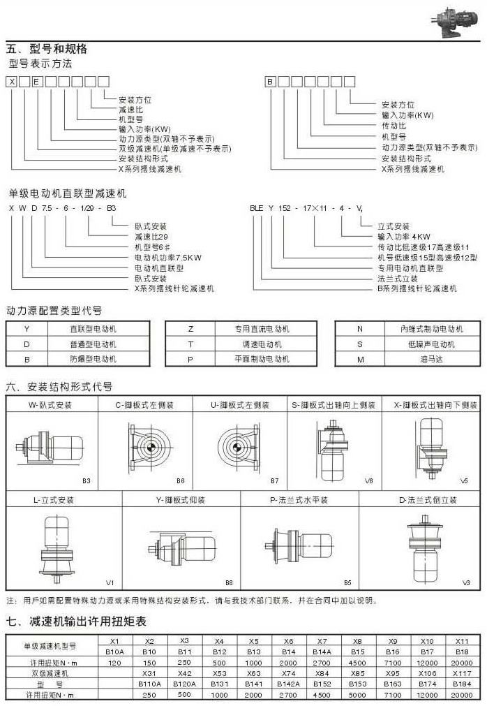 機(jī)型號(hào)和規(guī)格表示法安裝結(jié)構(gòu)形式代號(hào)減速機(jī)輸出許用扭矩表