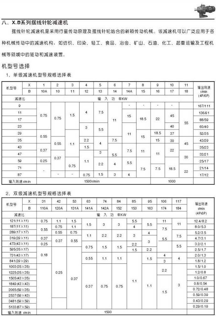 X . B擺線針輪減速機(jī)說明單級減速機(jī)型號規(guī)格選擇表雙級減速機(jī)型號規(guī)格選擇表