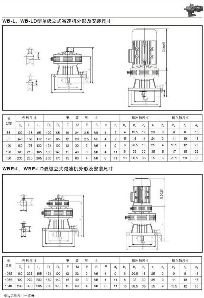 WB-L . WB-LD型單級(jí)立式減速機(jī)外型圖,安裝尺寸WBE-L . WEB-LD雙級(jí)立式減速機(jī)外型圖,安裝尺寸