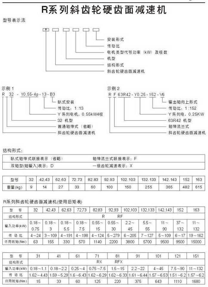 R系列斜齒輪硬齒面減速機(jī)型號(hào)表示法結(jié)構(gòu)形式使用扭矩表
